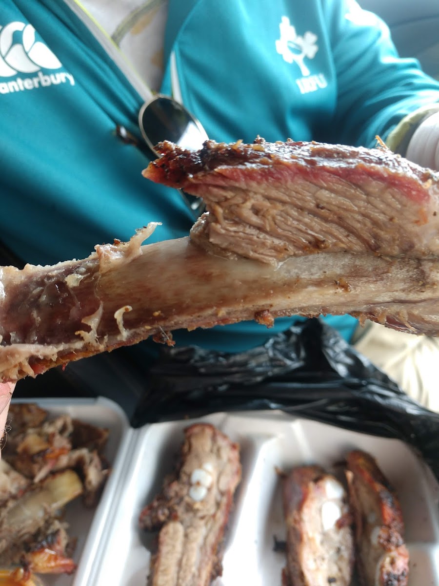 Only doing pick up now from curbside tent. At 115 on a Saturday all they had was ribs and steak. Nice portion of ribs. They aren't pretty. but they are good. Hacked up and miscut but I'm not complaining.Nice smoked flavor but not overwhelming. Good mustard based sauce potato salad was good very good value for that price point. Comes with a bottle water